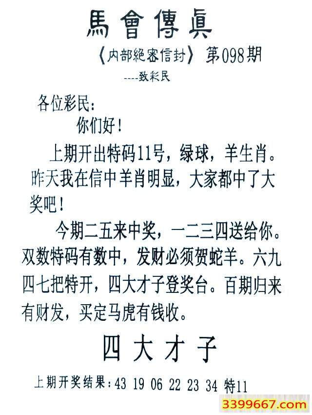 | 主题 :098期:首发推荐:≮馬會傳眞≯→(香港正版) |