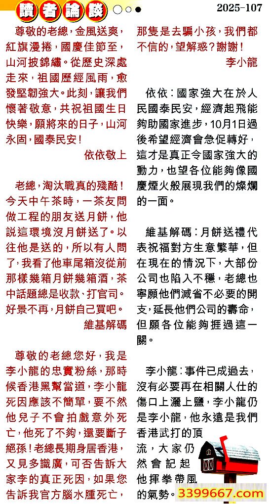 | 主题 :107期:彩民推荐〖貼信讀者論壇〗 |