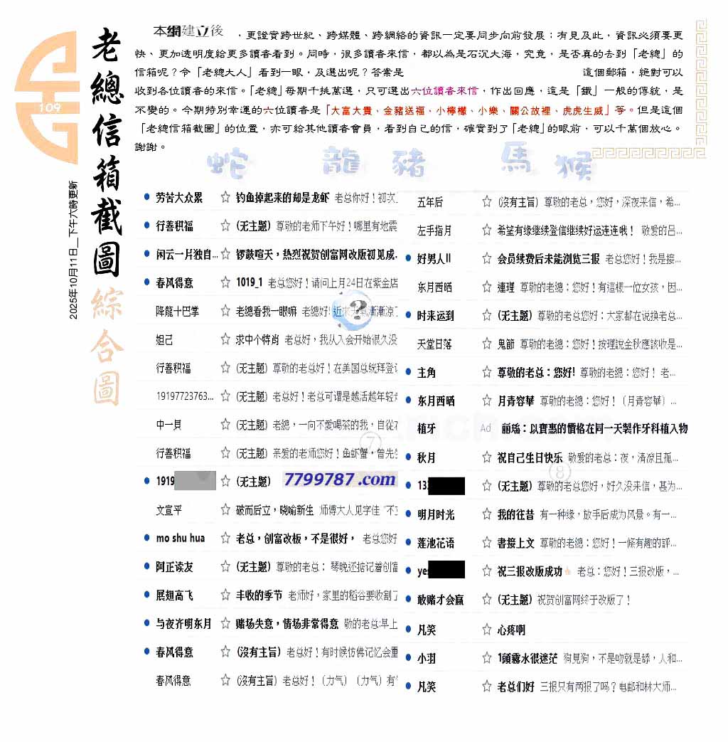 | 主题 :109期:六合皇金句/老总论码/萧公子/林大师/五行夺码/老总信箱截 |