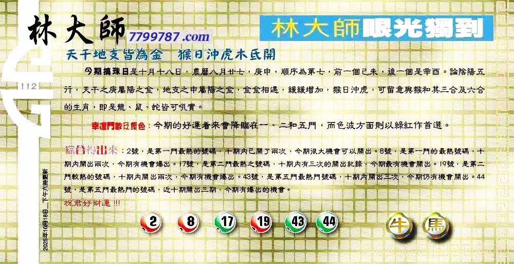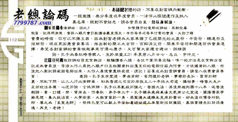 | 主题 :112期:六合皇金句/老总论码/萧公子/林大师/五行夺码/老总信箱截 |