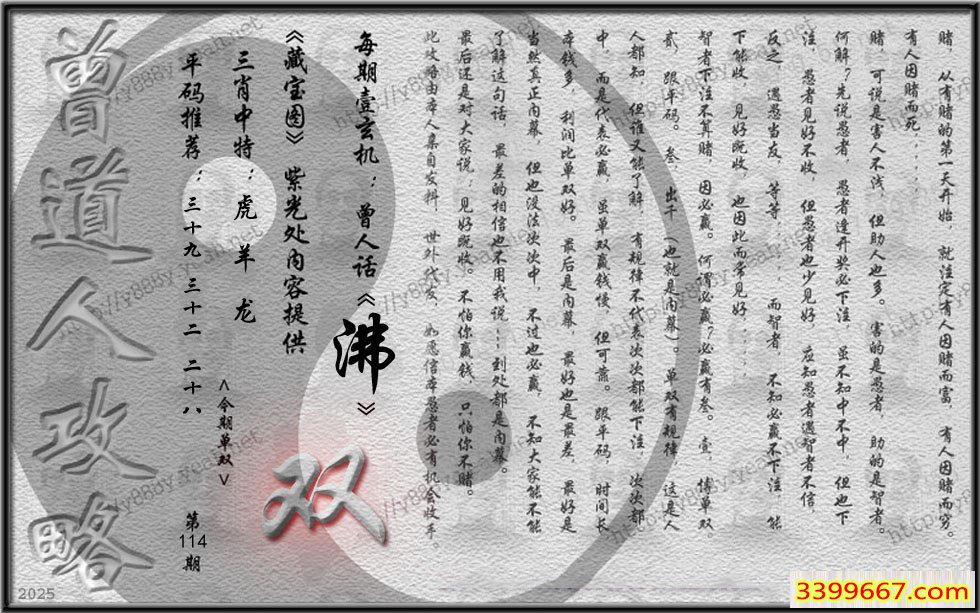 | 主题 :114期藏寶圖 新:不驾蒲轮左禹汤 老:闲上山来看野水 禁:狗 禁:9尾 |