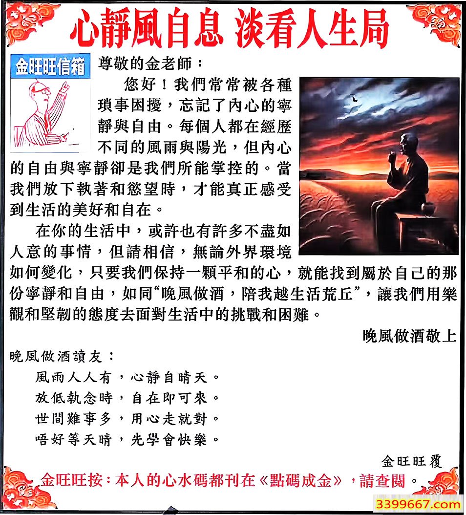 | 主题 :130期:金旺旺信箱彩民推荐→→《心靜風自息 淡看人生局》 |