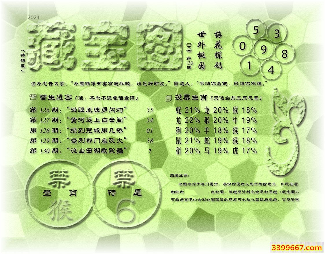 | 主题 :130期藏寶圖 新:道北轻风旆大开 老:流出西湖载歌舞 禁:猴 禁:6尾 |
