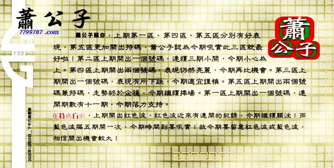 | 主题 :133期:六合皇金句/老总论码/萧公子/林大师/五行夺码/老总信箱截 |